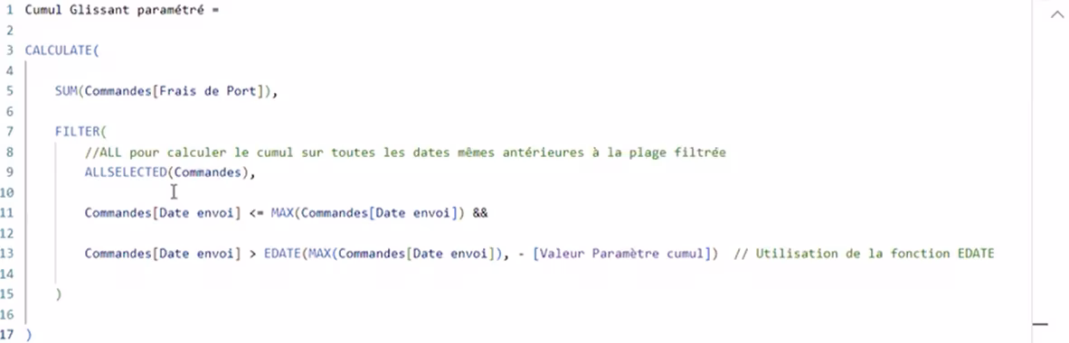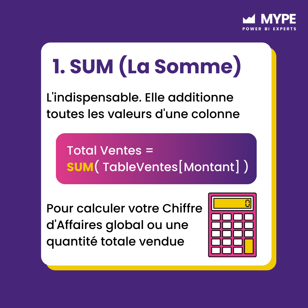 La fonction SUM() en DAX est utilisée pour effectuer la somme des valeurs d'une colonne spécifiée dans Power BI, elle permet d'additionner des valeurs numériques pour obtenir un total. Elle peut être utilisée avec des colonnes contenant des valeurs numériques, des mesures existantes ou des expressions calculées.
